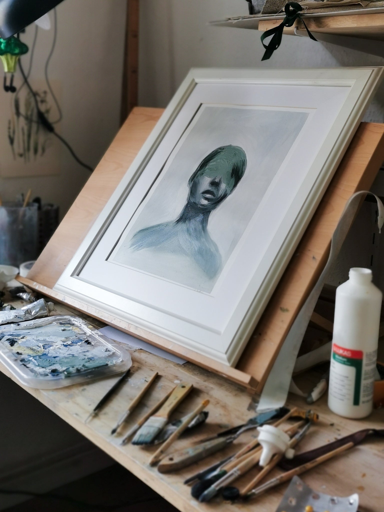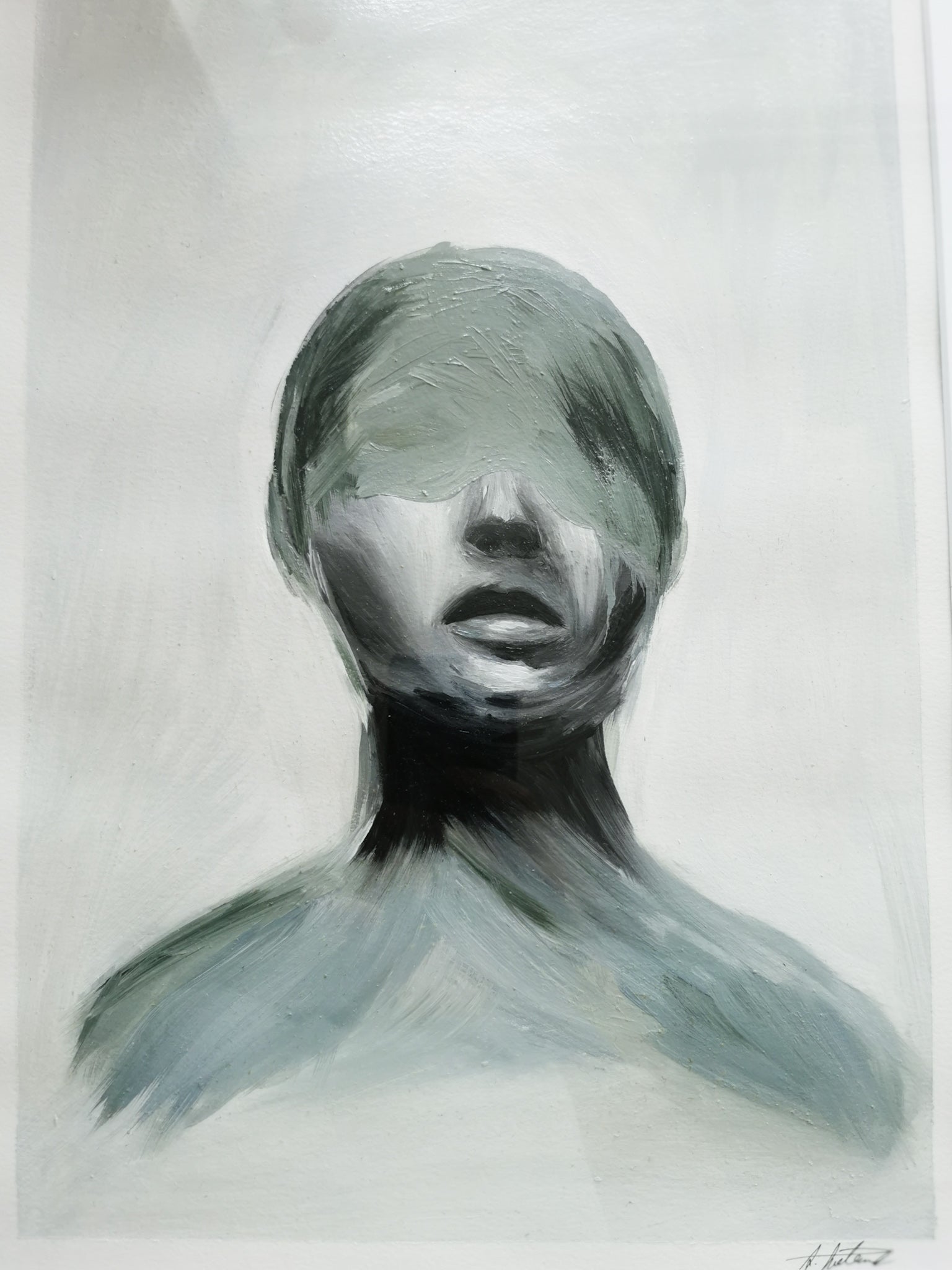 Das halb-abstrahierte Porträt in kühlen Grau- und Grünnuancen wirkt ruhig und konzentriert. Die verdeckten Augen stehen für den inneren Weg: Nicht alles ist klar, aber die Richtung stimmt. Wer dieses Bild betrachtet, erinnert sich daran, dranzubleiben, Entscheidungen selbst zu treffen und den eigenen Fokus zu halten.