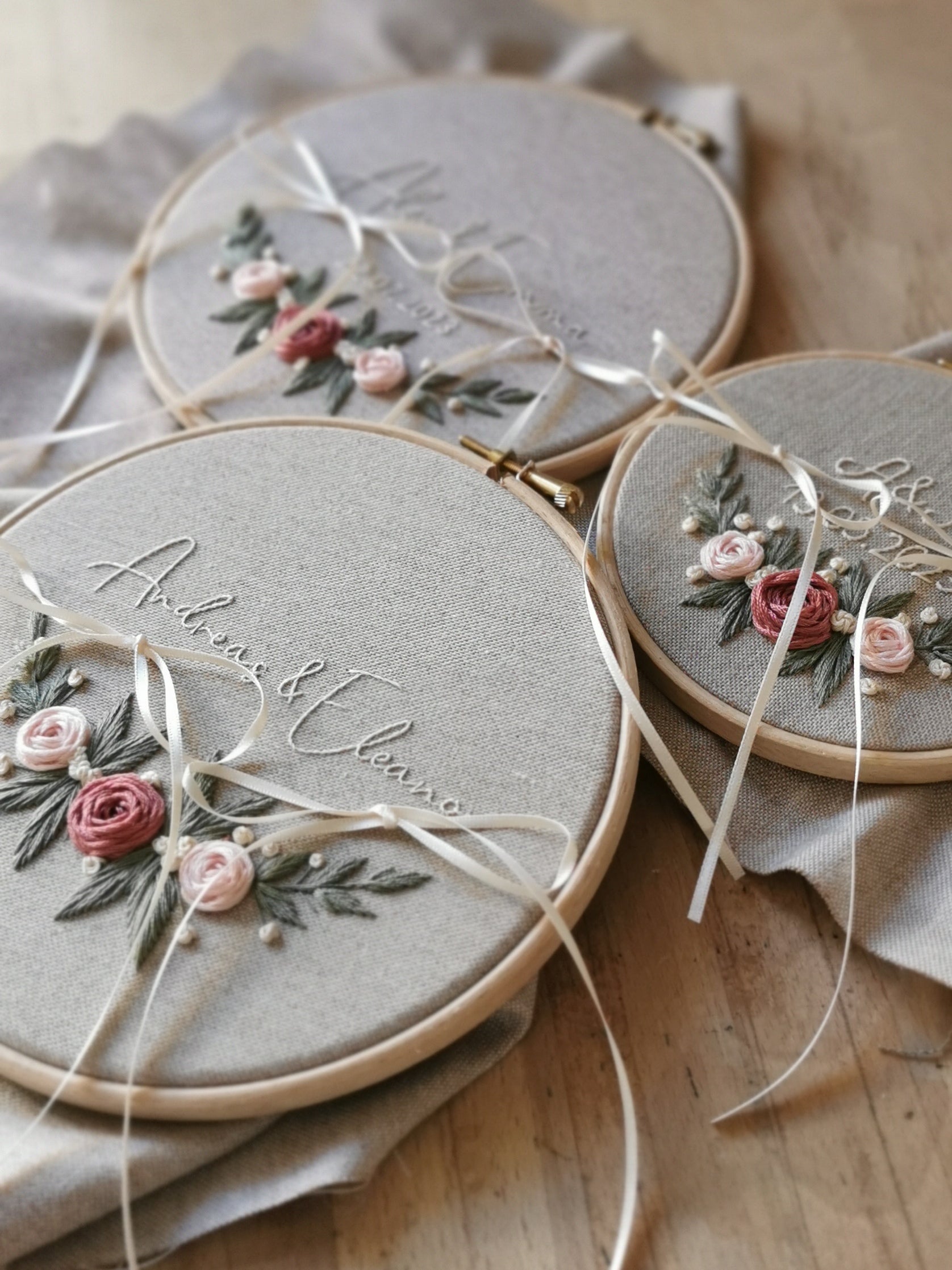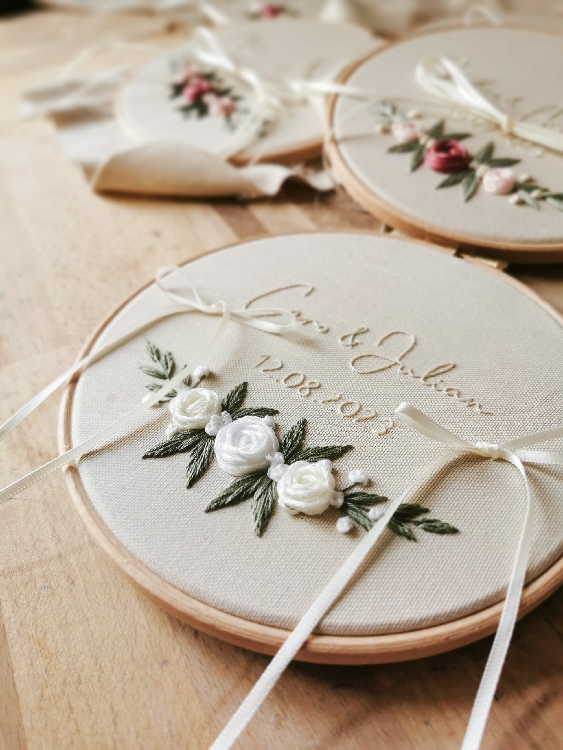 Die Schrift wird filigran von Hand gestickt – wahlweise in zarten Pastelltönen oder kräftigen Farben, ganz nach Eurem Geschmack.