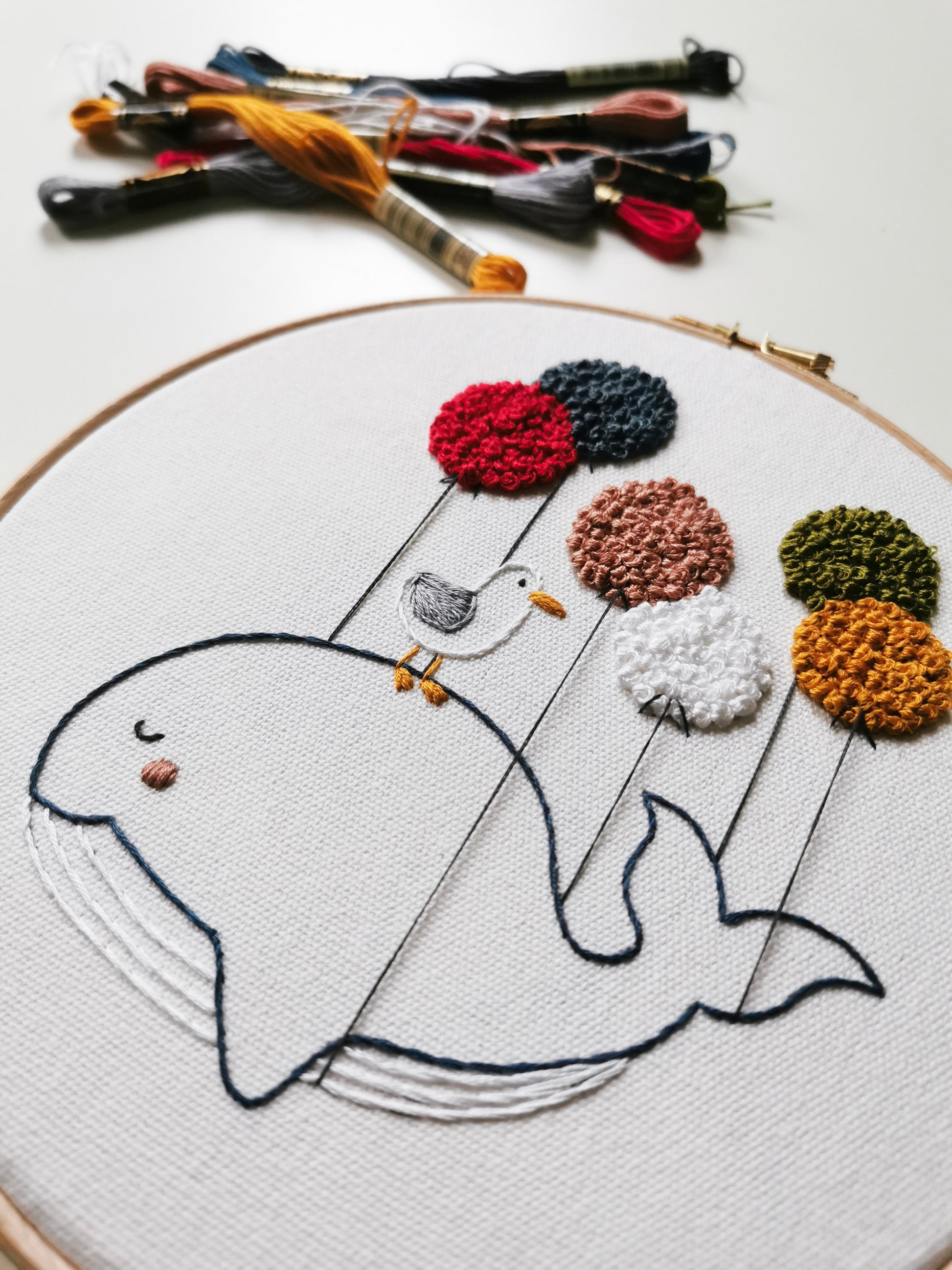 „Walibert“ bringt Leichtigkeit ins Kinderzimmer: ein fröhlicher Wal mit Luftballons und kleinem Vogel – einfach zu sticken, auch wenn Du gerade erst startest.