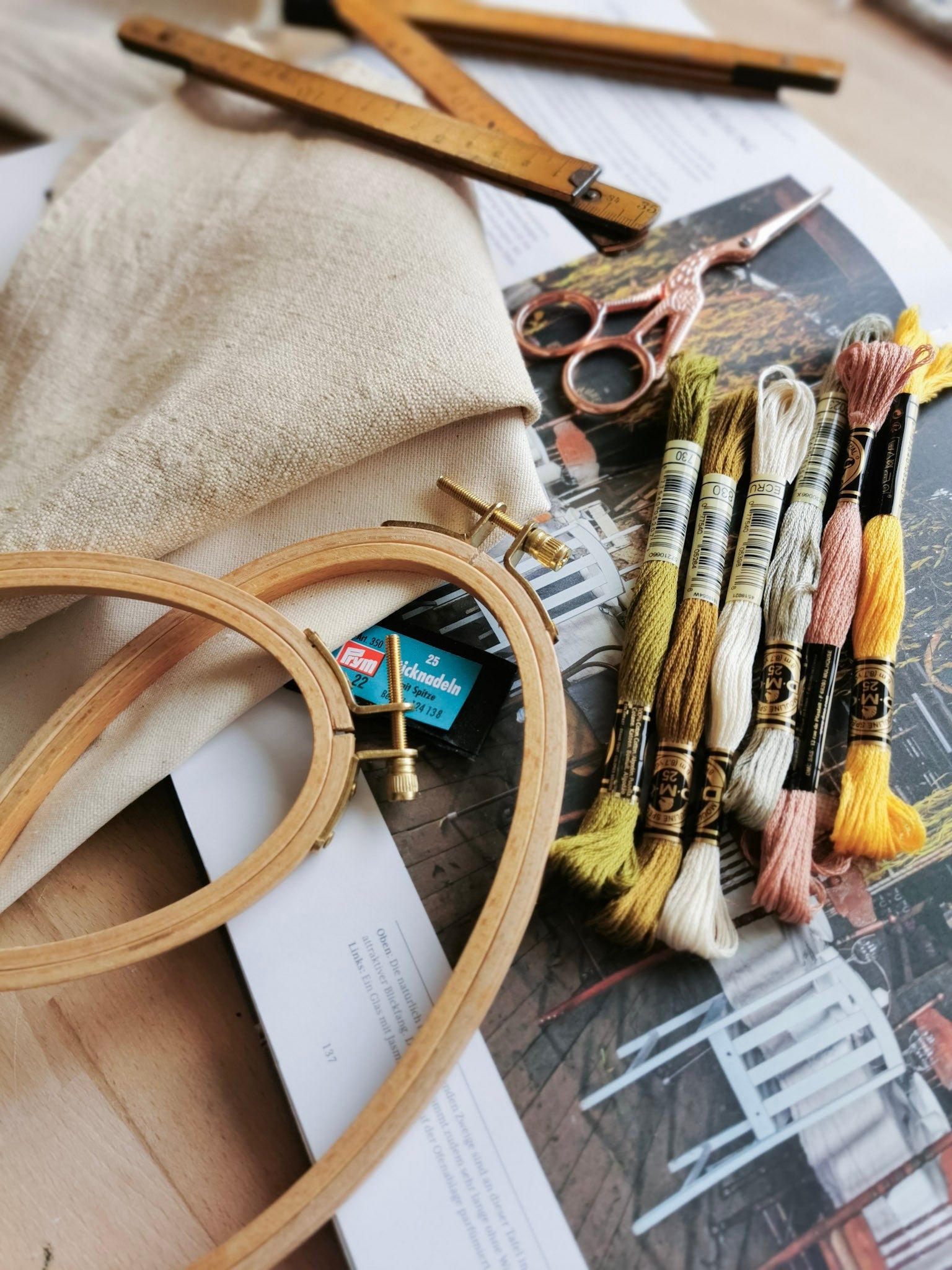 Highlights: 2 ovale Holzrahmen (Buchenholz, glatt geschliffen) • Stoffe: Bio-Canvas & echtes Vintage-Leinen (1943) • 6 DMC France Stickgarne – Wildblumen-Palette • Wildblumenvorlagen • Prym-Nadel • Leitfaden • Optional: Heatpen in Schwarz im Korktäschchen